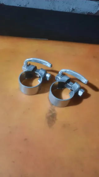Coppia di morsetti stringenti in acciaio nuovi fondo di magazzino anni 80 modello brevettato con perno quadro,misura in foto per informazioni ulteriori foto contattatemi pure posso spedire se richiesto prezzo riferito a singolo ricambio