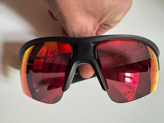 Occhiali sportivi marca Van Rysel, ideali per l'attività all'aria aperta. - Design avvolgente. - Lenti con finitura a specchio. - Montatura nera. presenti segni d’uso, piccoli graffi. come da fotografie