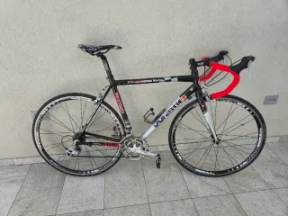 Bicicletta da corsa WHISTLE con telaio nero e argento e manubrio rosso. Copertoncini, freni e cambio in ottime condizioni. - Telaio in alluminio leggero. - Ruote con cerchi bianchi e neri a tema - Sella nera con dettagli bianchi "sellaitalia" -Guarnitura 36-50 -Pacco pignoni 11-28