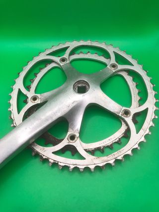 Guarnitura Campagnolo in alluminio. - Corona 52-42 denti. - Made in Italy. - Usata ma ancora funzionate - Evidenti segni di usura ottima per bici biciclette d’epoca vintage anni 80 eroica come Bianchi o Colnago o Shimano o Pinarello o Masi