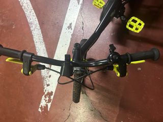 Bicicletta per bambini Btwin Dark Hero con ruote da 16 pollici. Design moderno in nero con dettagli in giallo. Utilizzata solo 4 volte. Adatta per bambini dai 4 ai 6 anni. Piccola marca sotto il manubrio dovuta all'ancoraggio alla mia bici.