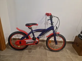 Bicicletta per bambini con design Spiderman, ideale per i più piccoli. - Ruote da 16 pollici. - Include i parafanghi. - Colori blu e rosso. - Parafango anteriore e posteriore e protezione della catena. - Design tematico Spiderman sul telaio e sulla catena. - Dettaglio sul sedile visibile nelle foto.