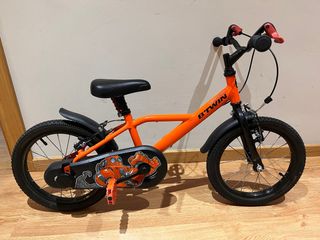 Bicicletta per bambini del marchio B'TWIN, ideale per i più piccoli. Colore arancione vibrante. Design con parafanghi. Ruote da 16 pollici.