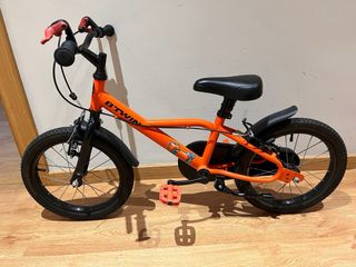 Bicicletta per bambini del marchio Btwin, ideale per i più piccoli. Il suo vistoso colore arancione la rende molto visibile. - Telaio in acciaio. - Ruote da 16 pollici. - Freno anteriore e posteriore. - Sella regolabile in altezza. - Parafanghi anteriore e posteriore. È possibile aggiungere parafanghi.