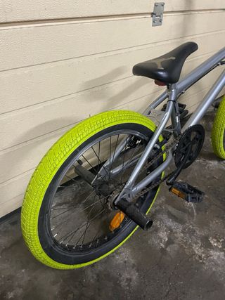 Bicicletta BMX di dimensioni per bambini, ideale per iniziare nel mondo del BMX. - Telaio argentato. - Ruote con cerchioni neri e pneumatici rossi. - Manubrio nero con grip gialli e neri. - Sella nera.