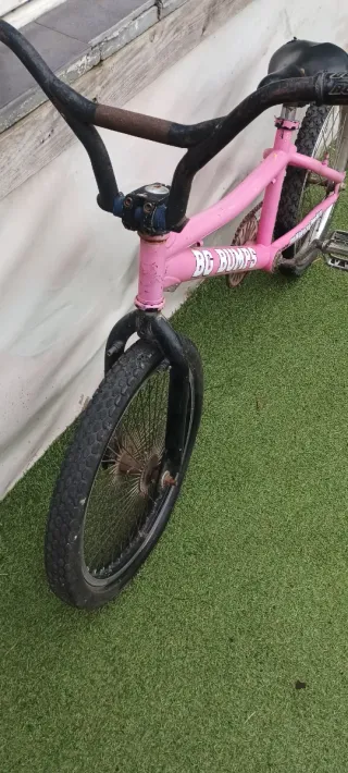 Bicicletta BMX del marchio Monty in colore rosa. Piccoli difetti, sella leggermente danneggiata e qualche piccola riparazione necessaria. - Telaio BMX. - Ruote BMX. - Sella nera.