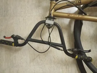 Set di componenti per bicicletta BMX. Include: telaio dorato, manubrio nero, pedali e ruote.