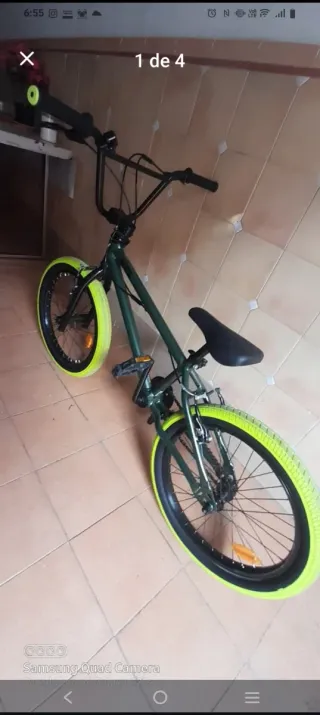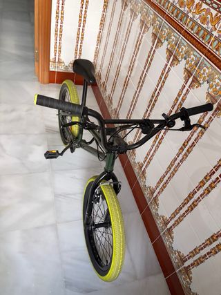 Bicicleta BMX verde con ruote gialle brillanti. Ideale per iniziare con il BMX, praticamente nuova. Include: telaio BMX, ruote gialle lucide, manubrio BMX.