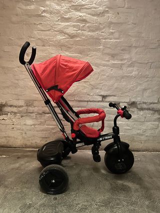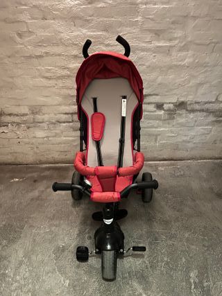 Triciclo versatile per bambini e bambine, ideale per accompagnare la crescita. - Colore rosso e nero. - Maniglione direzionabile per i genitori. - Cappottina parasole. - Seduta imbottita.