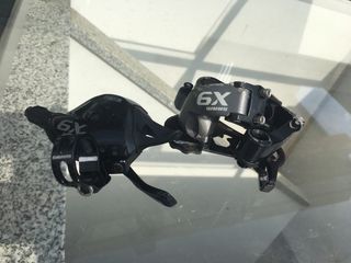 cambio e manettino Sram X9, 10 velocità, qualche segno di usura ma perfettamente funzionante.