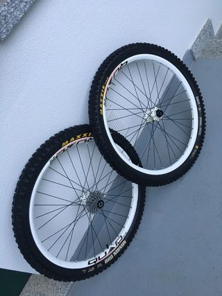 ottime condizioni, cuscinetti appena cambiati (70 euro costo totale). gomme maxxis in buone condizioni incluse. Ruote da 26 per downhill dritte e robuste. inclusa cassetta pignoni da DH. misure mozzi anteriore 20x110 e posteriore 12x150 invio in spagna solo con seur, invio in italia brt. (scelta obbligata date le dimensioni)