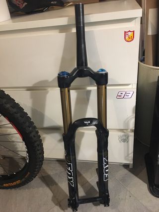 forcella freeride/DH Fox Van per ruota da 26, canotto tapered tagliato a 19cm. la forcella ha il trattamento kashima agli steli ed è il top di gamma. è appena stata revisionata, bisogna solo montarla e andare a divertirsi... escursione generosa per discesa ma rimane comunque una forcella pedalabile. qualche piccolo difetto estetico sui foderi. spedizione in spagna solo seur, in italia solo brt o poste. (il pacco è troppo grande per inpost)