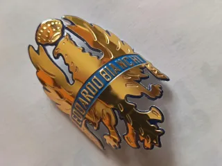 Stemma adesivo in metallo per telaio di bicicletta. - Design a forma di aquila dorata. - Fascia blu con scritta EDOARDO BIANCHI.