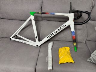 Telaio per bicicletta verniciato Colnago V5rs taglia 54. Design moderno e aerodinamico. Colore bianco con dettagli multicolori. Logo Colnago visibile. Include manubrio integrato, sella e forcella. Rodiggi, cambio, ecc. Materiale Taiwan. Spedizione immediata o visita a Mostoles.