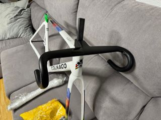 Bicicletta da strada Colnago in bianco. Il sellino è della marca San Marco. - Telaio della bicicletta. - Manubrio con nastro bianco. - Sellino San Marco.