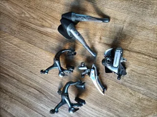 Mini gruppo Shimano 600 Tricolor (serie 6400), un classico per la tua bici. - Leve freno (passaggio cavi interno) - Cambio posteriore - Deragliatore anteriore - Freni anteriori e posteriori Gruppo di ottima qualità della Shimano Tutti i pezzi regolarmente funzionanti, esteticamente in discrete condizioni ideale per restauro a basso costo di bici corsa anni 90 come Colnago bianchi cinelli spedizione veloce
