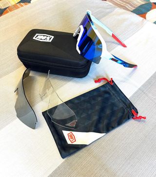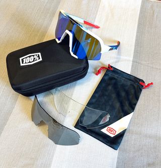 Occhiali da ciclismo nuovi con custodia, comprende due lenti aggiuntive, una nera e una trasparente.