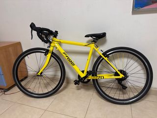Bicicletta da strada Frog Bikes modello 58, ideale per bambini. Ideale per bambini di 6-7 anni che vogliono iniziare a competere. - Telaio in alluminio leggero. Peso 8,2 kg. - Ruote da 20 pollici. - 8 cambi. - Freni a pinza. - Manubrio da strada. - Include coperture da ciclocross oltre a quelle da strada. - Usata 2 stagioni (aprile-settembre). - Leve con segni di sfregamento come si vede nelle foto. Il resto della bici è intatto.