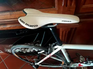 Bicicletta da corsa telaio Pinarello taglia L con manubrio dritto in carbonio, e reggisella in carbonio. 11 velocità monocorona, movimento centrale cavi guaine freni ganasce pedali pedivelle cambio tutto nuovo e regolato alla perfezione. Sella selle Italia ruote mavic cosmic Elite da 28 ci Pneumatici nuovi da 28mm, vendo la bici praticamente al prezzo delle sole ruote.