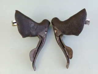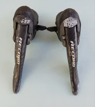 Coppia di leve freno e cambio Campagnolo Record per bici da corsa. - Compatibili con trasmissioni 2x10 velocità. - Realizzate in carbonio. - Design ergonomico.