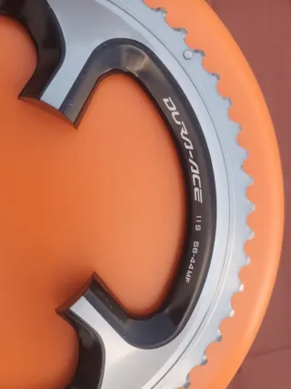 Pedalaio per bicicletta Shimano Dura-Ace, modello 9000 - 56 denti. Praticamente nuovo, senza segni d'uso. I piccoli difetti presenti sono dovuti al ri-confezionamento dopo la conservazione. È un prototipo da montare su bici da cronometro.