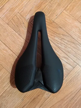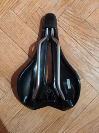 Sedile per bicicletta in nero, adatto per ciclismo su strada o in montagna. Design ergonomico e moderno. Materiale: nero opaco. Design con canale centrale. Superficie con microperforazioni per una maggiore aderenza.