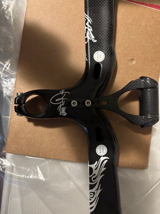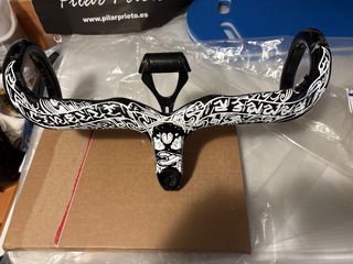 Manubrio da bici da strada in carbonio con un design unico. - Materiale: Carbonio - Design: Tribale bianco su nero - Tipo: Strada - Potenza: 90mm - Larghezza: 420mm Ho effettuato uno studio biomeccanico e devo cambiare la misura. Cavi interni e un po' saltato dove le leve sono strette. In regalo supporto per orologio in carbonio.