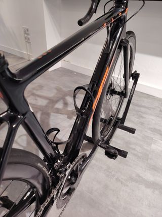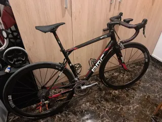 Bicicletta da strada BMC GF02 in nero con dettagli rossi. Progettata per prestazioni ottimali su strada. Cambio Shimano 105 10v, pignoni 11×30, corone 50 e 34. Telaio in alluminio, da riparare, sembra avere alcune crepe, motivo per cui la vendo, revisionata di recente da Decathlon. Freni a ganascia. Ruote in carbonio CSC Aliexpress (adesivo DT Swiss). Nuove, montate 2 mesi fa. Sella e portaborraccia come nell'ultima foto. Manubrio in carbonio Kocevlo Aliexpress. Montato di recente. Attacco in carbonio Aliexpress. Pneumatici 700x28c Continental Grand Sport, nuovi. Cablaggio tutto nuovo.