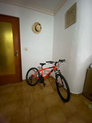 Bicicletta da montagna in colore arancione. Telaio in alluminio. Sospensione anteriore. Freni a disco.