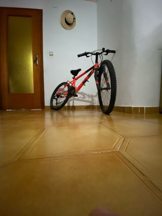 Bicicletta da montagna arancione. - Telaio ROSSO. - Ruote da 26 pollici. - Sella nera. - Pedali neri.