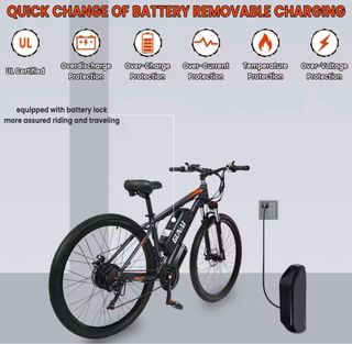 Bicicletta elettrica Fafrees Hailong One26 in colore nero e arancione. - Telaio in alluminio. - Ruote da 26 pollici. - Freni a disco. - Batteria integrata nel telaio.