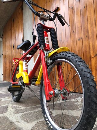 Bicicletta da cross in stile vintage, con una vivace combinazione di colori rosso e giallo. - Telaio robusto - Ruote da 16”. - Manubrio nero. - Sella nera. - Ruote con pneumatici Kenda nuovi. Bicicletta completamente revisionata e perfettamente funzionante.