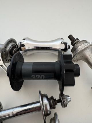 -Ant Ofmega 36 fori corpo rotto, perno ok. -Post Ofmega 36 fori ok -DT SWISS 370 post 32 fori con una vite bloccata nel gancio e senza perno -Shimano ant WH-R560 16 fori da aprire pulire e ingrassare -Ant 28 fori ok -Ant 36 fori da da aprire pulire e ingrassare -Union ant completamente bloccato -Post 36 fori con cassetta, gira bene. -Ant 36 fori con sgancio non completo, completamente bloccato -Post 36 fori con perno a dadi (mancanti) gira bene -Campagnolo Chorus ant 32 fori, con sgancio rapido. Da ingrassare -Campagnolo Mirage ant 32 fori senza perno -Giant post in carbonio, 32 fori, da ingrassare -Campagnolo Mirage ant, 36 fori,
