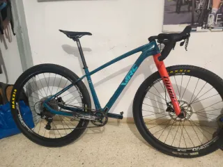 Bicicletta da montagna con estetica gravel, modello WRC Monster. Trasmissione apex 11x1. Sellino in carbonio con sbeccature di vernice sul tubo orizzontale ma nessuna fessura. Telaio di colore verde-azzurro in carbonio. Forcella anteriore rossa in carbonio, pedali Rotor 3D. Ruote Maxxis G540. Pneumatici Maxxis Ikon 29. 2.2. Tubolari.