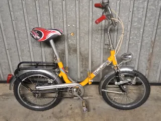 Bicicletta pieghevole Giolitta in stile Graziella, ideale per bambini. - Ruote da 14 pollici. - Telaio pieghevole. - Sella con grafica colorata. - Portapacchi posteriore. - Manopole rosse. - Campanello. - Faro anteriore.