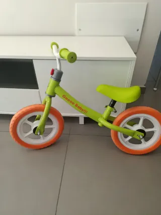Bicicletta senza pedali di colore verde, ideale per i più piccoli. - Manubrio con impugnature comode. - Sella regolabile in altezza. - Ruote con cerchi bianchi e pneumatici arancioni.