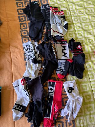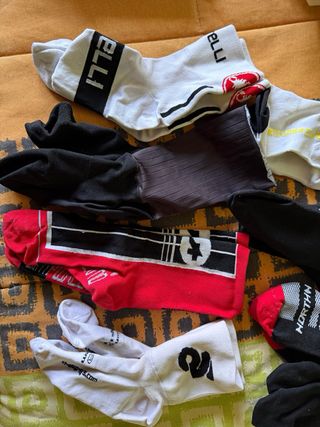 Lotteria di undici paia di calzini da ciclismo. Design vari. Tessuto comodo e traspirante. Taglia unica (io indosso una 43 e vanno bene). Alcuni con qualche segno di utilizzo, altri nuovi. Vendo per lasciare lo sport.