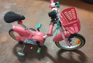 Bicicletta per bambini di colore rosa. Design con personaggi Disney. Sedile aggiuntivo per bambola o giocattolo. Ruotine. Necessita di una buona pulizia ma è in ottime condizioni.