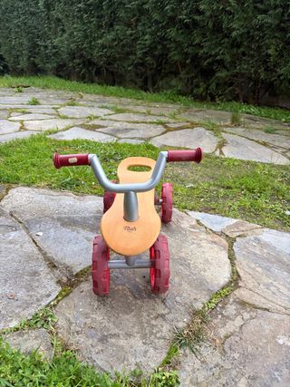 Triciclo per bambini con sedile in legno e manubrio metallico. Ruote in gomma rosse. Impugnature del manubrio rosse.