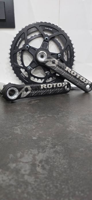 Guarnitura Rotor in CNC, con corone 52/36 compresa di pedivelle da 172.5mm, peso totale solo 620gr. In ottime condizioni utilizzata per una stagione. Per altre foto o info contattami senza impegno. Spedizione sempre veloce e imballaggio molto curato. Offro sempre serietà e professionalità. Grazie.