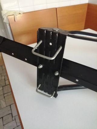 - Binario in due pezzi (per allungare/accorciare a seconda della distanza delle barre sul tetto). Portabici universale TOP BIKE idoneo per barre tetto con spessore max 48x40 mm. - Acquistato e mai usato. Tipologia fissaggio bici: telaio + ruote. - In acciaio verniciato nero, viteria antiruggine, carico massimo 15 kg, peso del portabici 2,3 kg, dotato di 2 cinghie di sicurezza, binario per pneumatici bici da corsa alla MTB. - (memo: “serratura” della manopola è difettosa da nuova; manopola invece funziona perfettamente) - Possibilità spedizione (no Poste It.); altrimenti ritiro a mano a Milano Sud (zona Famagosta).