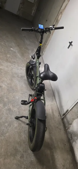 Bicicletta elettrica dal design pieghevole e colore verde militare. - Telaio robusto. - Ruote larghe. - Sella regolabile. - Display sul manubrio. appena messo gomme antibuco e pastiglie freni, regalo porta cellulare, lucchetto antifurto, due pastiglie freni nouva in totale costano 180€ il prezzo poco trattabile grazie