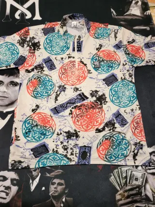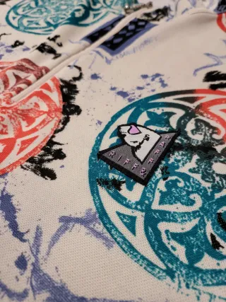 Set di due maglie da ciclista vintage con un design unico. - Fantasia con cerchi rossi e blu e motivi astratti. - Collo alto con zip. - Maniche corte.