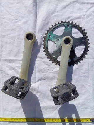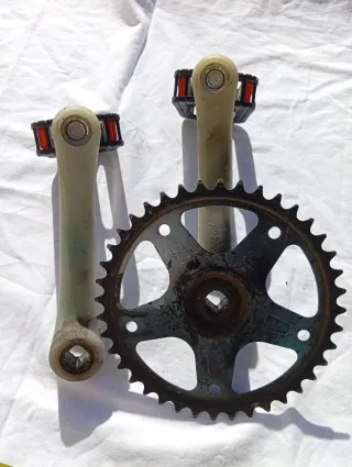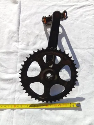 Guarnitura per bicicletta in metallo cromato. 40 denti. - Braccio pedivella singolo. - Corona singola con protezione in plastica trasparente.