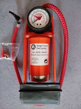 Pompa a pedale singola, ideale per gonfiare pneumatici. - Manometro integrato per il controllo della pressione. - Tubo flessibile rosso con rinforzo. - Include adattatori per diverse valvole.