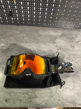 Maschera da downhill Melon Optics con lenti a specchio. - Montatura nera con dettagli a spruzzo. - Lenti arancioni a specchio. - Cinturino con grafica colorata. - Sacca porta maschera inclusa.