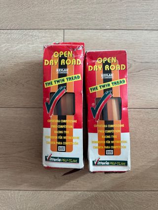 Coppie di copertoni Vittoria Open Dry Road. - Misura 700x20c. - Tecnologia Kevlar Compound. - Design Twin Tread. - Adatti per competizioni. - Made in Italy. Fondo di magazzino. Nuovi mai usati o montati. Ecco alcune caratteristiche chiave: Modello: Vittoria Pro-Team Tipo: Open Tubular (copertoncino con carcassa simile a un tubolare) Misura: 700x20c (20-622) Utilizzo: Strade asciutte ("Open Dry Road") Ottimo per restauri e preparazione bici da corsa per manifestazioni come ciclo storiche.