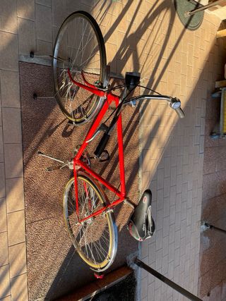 Bicicletta da uomo restaurata con cura, pronta per nuove avventure. - Telaio rosso brillante. - Sella nuova e confortevole. - Manubrio classico con impugnature nere. - Ruote con cerchi cromati.