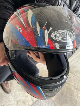 Casco integrale da moto con grafica sportiva. - Colore nero con inserti rossi e blu. - Visiera trasparente. 30 euro chiamare angelo 3406875201 - Logo OSBE sul fronte.