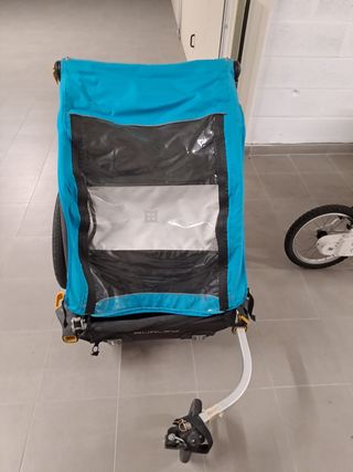 Rimorchio e passeggino per bici, ideale per trasportare bambini. Marca Burley D'Lite X. Leggero ma robusto, facilmente maneggevole, e' dotato anche di una cappottina in pvc per proteggerlo Durante i periodi di inutilizzo - Colore blu e nero. - Finestre trasparenti. - Marca Burley.